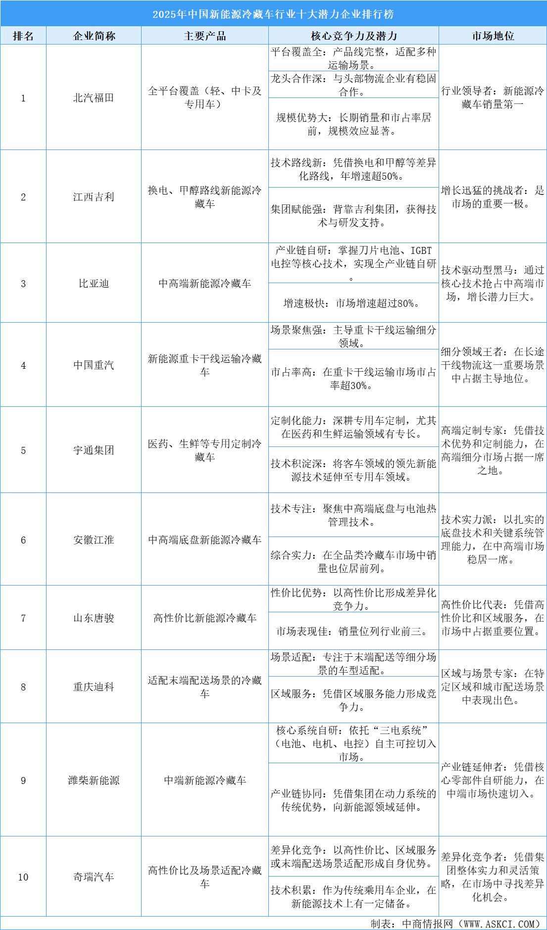 电子游艺官网讯:2025年中国新能源冷藏车行业十大潜力企业分别为:北汽福田、江西吉利、比亚迪、中国重汽、宇通集团、安徽江淮、山东唐骏、重庆迪科、潍柴新能源、奇瑞汽车。