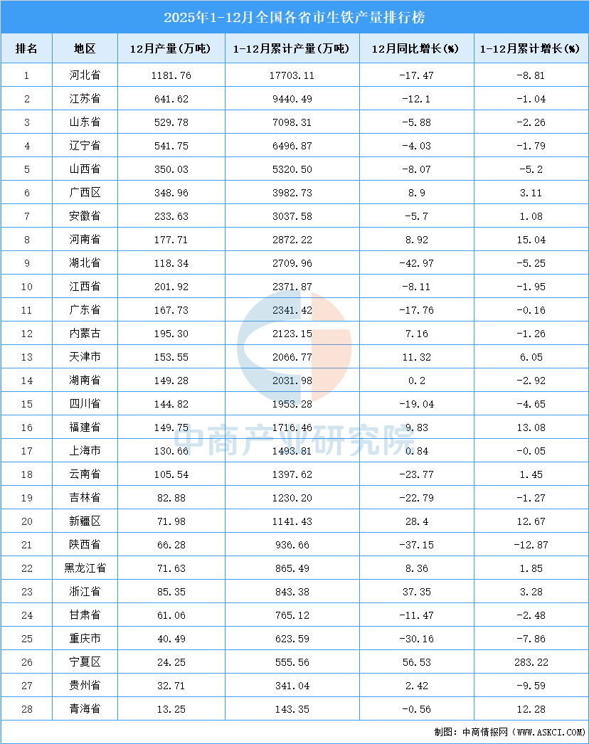 2025年全国生铁产量前十省市分别是河北省、江苏省、山东省、辽宁省、山西省、广西、安徽省、河南省、湖北省、江西省。其中,2025年河北省生铁产量排名第一,累计产量为17703.11万吨。