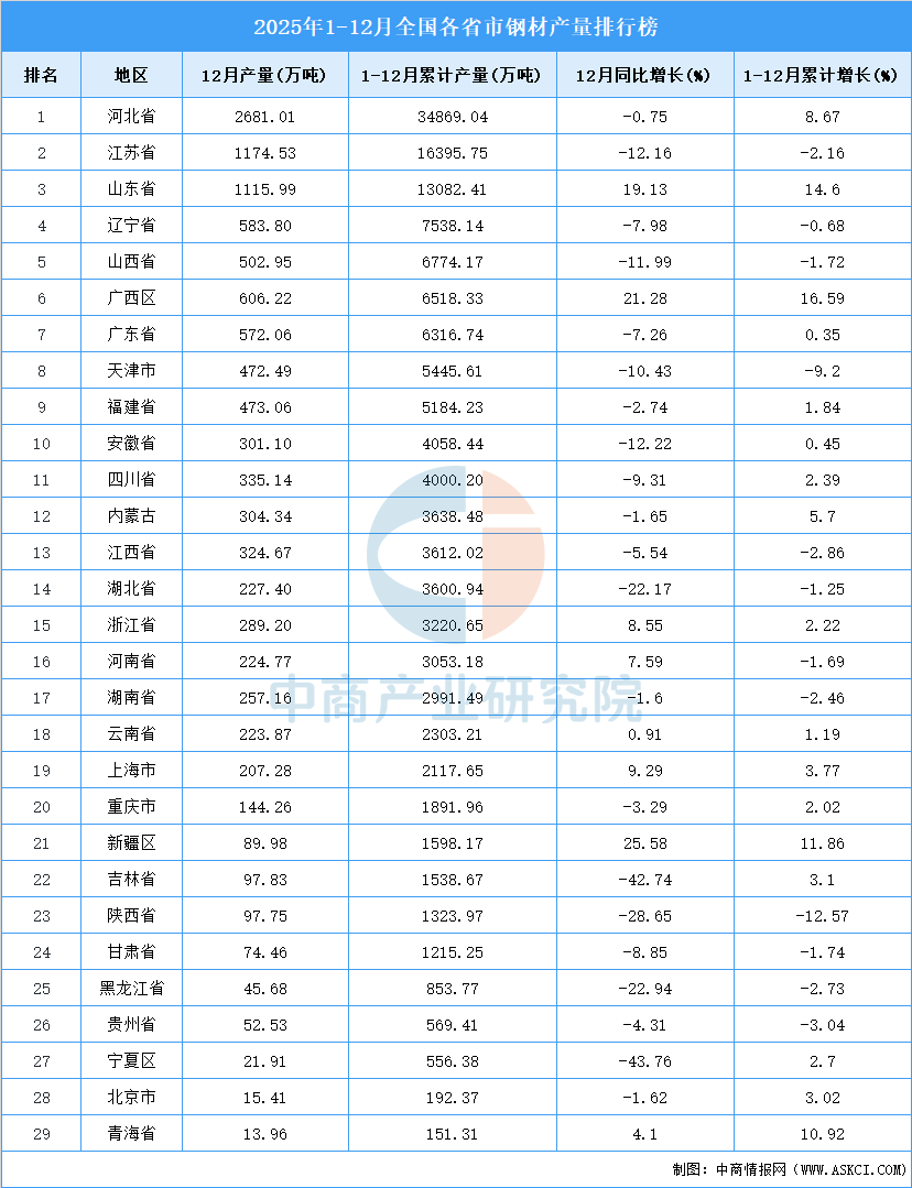 2025年全国钢材产量前十省市分别是河北省、江苏省、山东省、辽宁省、山西省、广西、广东省、天津市、福建省、安徽省。其中,2025年河北省钢材产量排名第一,累计产量为34869.04万吨。