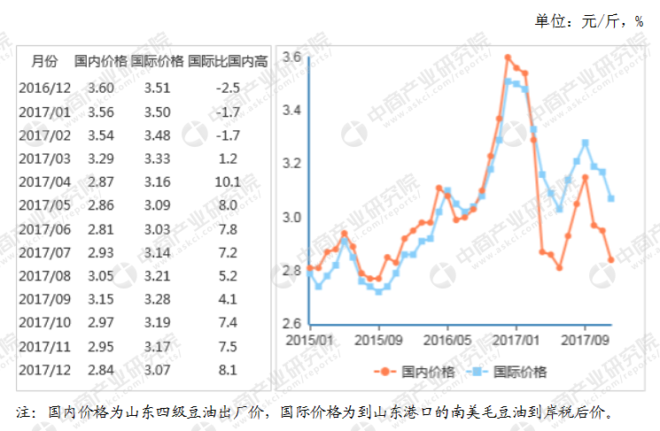 (二)国际市场油籽油脂价格下跌。油菜籽方面,据加拿大农业食品部发布的供需报告显示,2017/18年度加拿大油菜籽期末库存预计达到200万吨,比11月17日预测的100万吨高出一倍,库存压力凸显。棕榈油方面,据马来西亚两家船运机构(ITS和SGS)发布的数据,预计12月份马来西亚棕榈油出口量环比下降2%左右,库存将上升至270万吨左右,创历史同期新高。12月份,加拿大油菜籽CNF均价(离岸价+运费)每吨456美元,环比跌2.6%,同比跌2.6%;南美豆油CNF均价每吨808美元,环比跌3.5%,同比跌10.4%;马来西亚24度棕榈油离岸价月均每吨624美元,环比跌6.7%,同比跌16.5%。