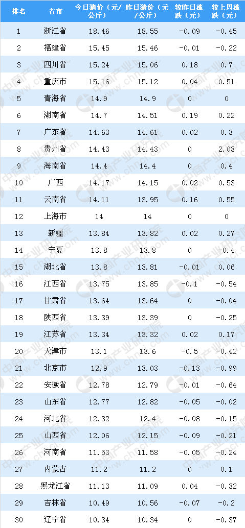 从土杂猪价格来看,10月16日全国土杂猪价格最高的是浙江省,达18.46元/公斤,较昨日价格相比下跌0.09。