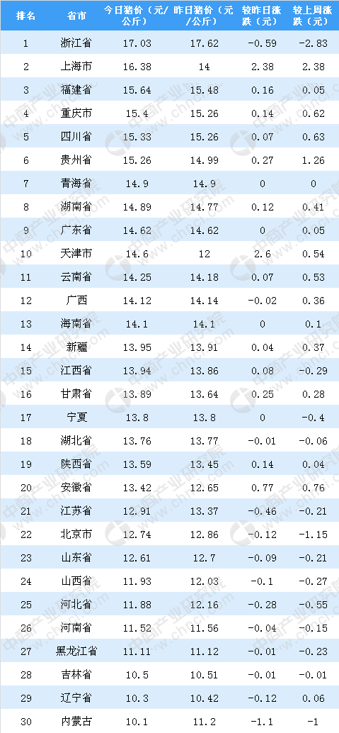 从土杂猪价格来看,10月18日全国土杂猪价格最高的是浙江省,达17.03元/公斤,较昨日价格相比下跌0.59。