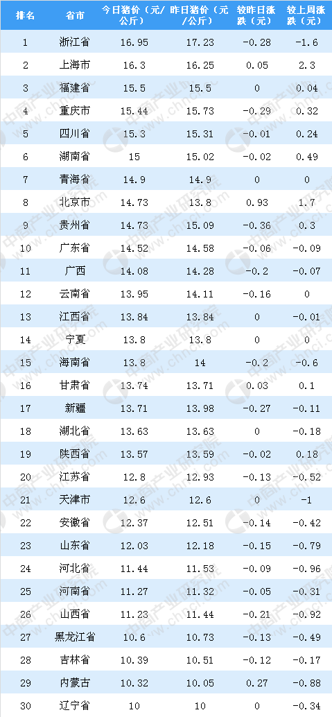 从土杂猪价格来看,10月22日全国土杂猪价格最高的是浙江省,达16.95元/公斤,较昨日价格相比下跌0.28。