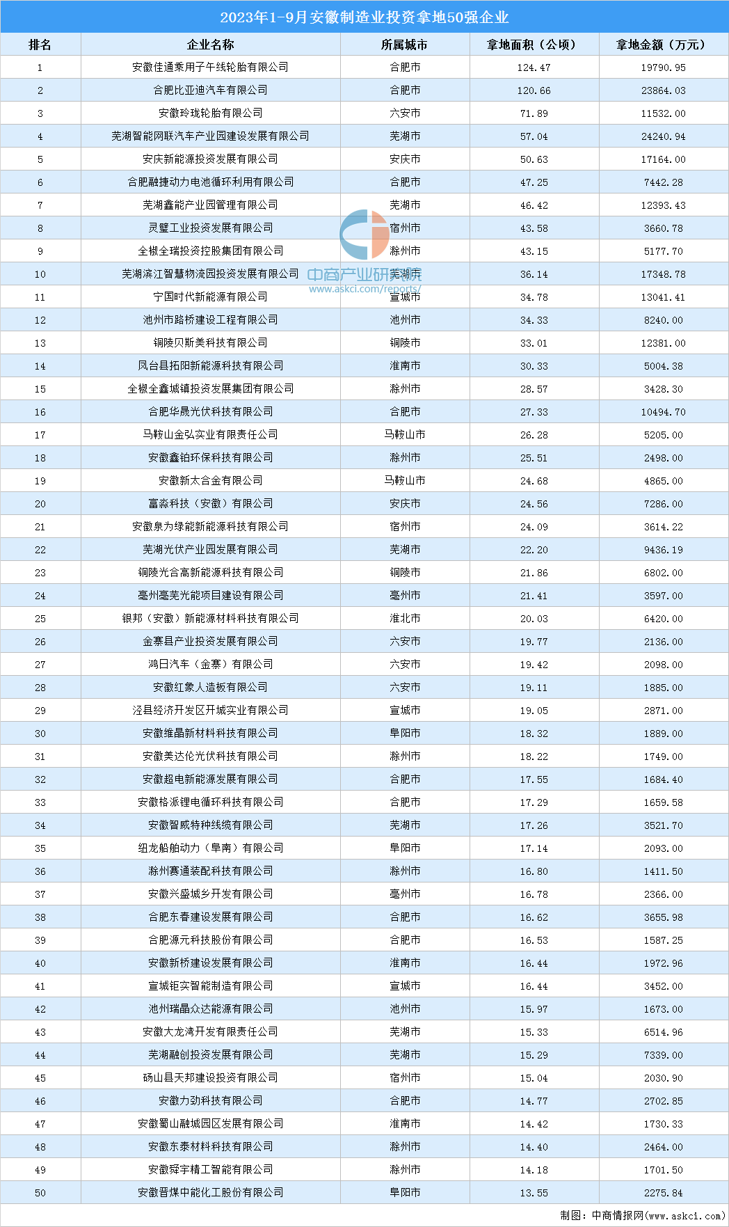 电子游艺官网讯:中商产业研究院产业招商情报库监测数据显示,2023年1-9月安徽制造业投资拿地50强企业出炉。榜单显示,安徽制造业投资拿地50强企业拿地面积共计1455.90公顷,入围门槛13.55公顷,拿地金额30.94亿元。