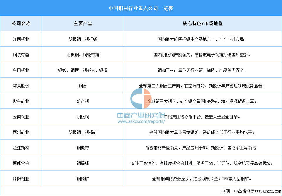 中国铜材行业重点公司包括三大类:以江西铜业、铜陵有色为代表的全产业链巨头,覆盖采矿到加工全流程;以紫金矿业为核心的资源企业,掌控铜矿资源;以及以海亮股份、楚江新材、博威合金为代表的专业化加工龙头,在铜管、铜板带、高性能合金等细分领域建立技术优势,共同推动行业向高精度、高性能方向转型。