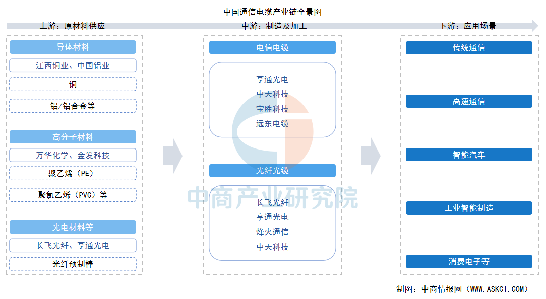 通信电缆是现代通信系统的核心基础设施,专门用于传输电信号或光信号。通信电缆产业链结构清晰,上游主要涉及原材料供应,中游是各类通信电缆的制造,下游则广泛应用于通信、汽车、工业等多个领域。