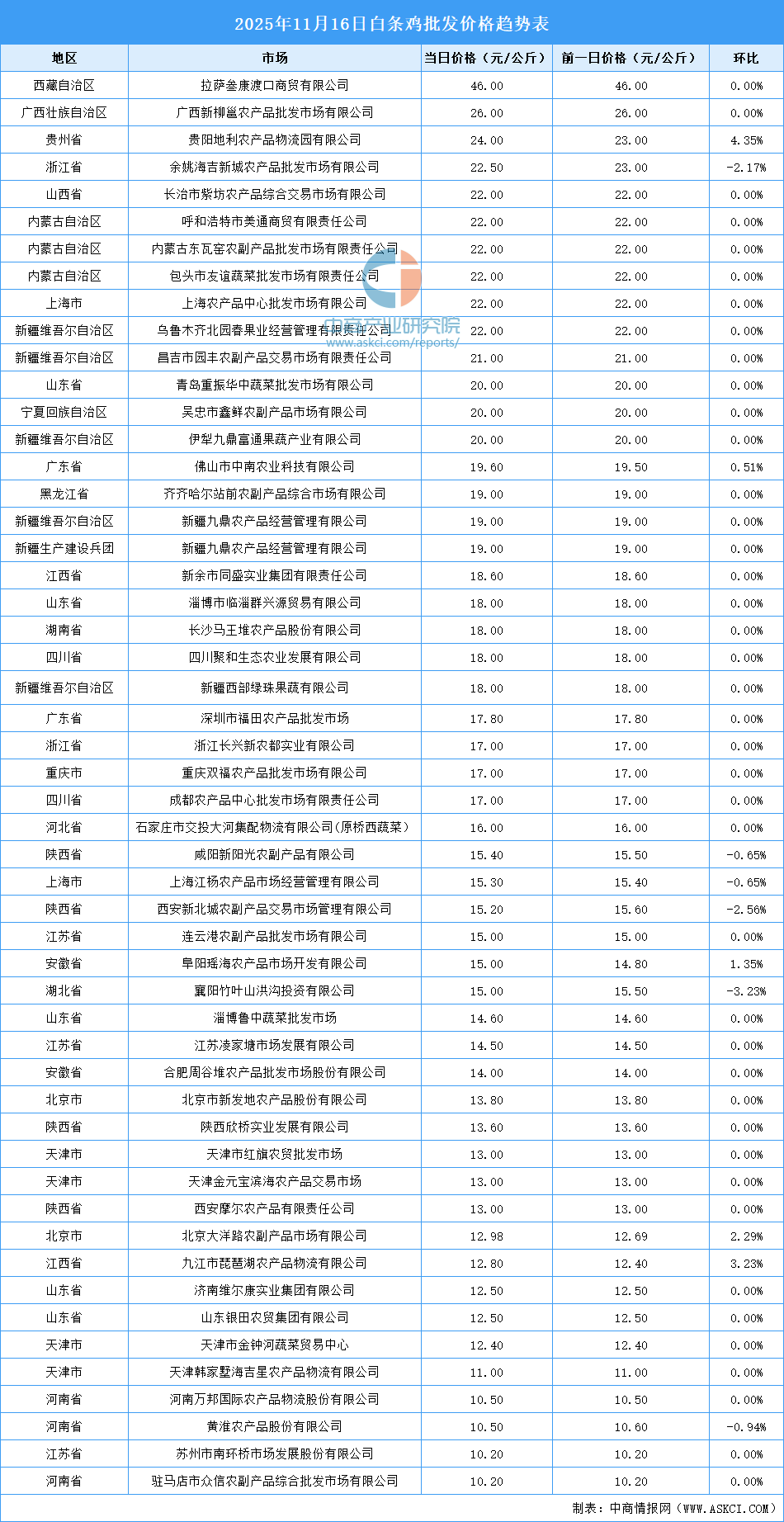 电子游艺官网讯:最新数据显示:11月16日全国白条鸡平均价格为17.30元/公斤。其中,白条鸡价格最高的市场是拉萨叁康渡口商贸有限公司,当日价格为46.00元/公斤,环比持平。白条鸡价格最低的市场是苏州市南环桥市场发展股份有限公司、驻马店市众信农副产品综合批发市场有限公司,当日价格均为10.20元/公斤。