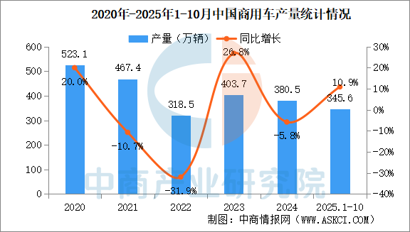 电子游艺官网讯:2025年10月,商用车产销分别完成36.4万辆和36.1万辆,环比分别下降3.3%和1.9%,同比分别增长25.4%和21%。2025年1-10月,商用车产销分别完成345.6万辆和347.9万辆,同比分别增长10.9%和9%。
