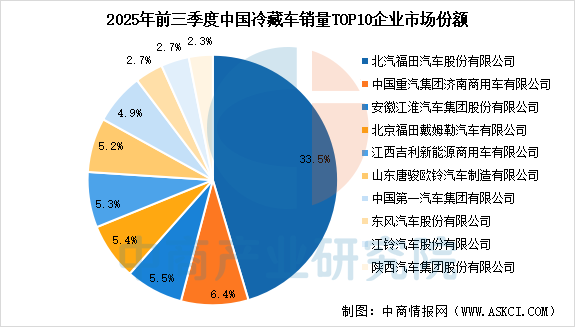 从冷藏车市场竞争格局来看,2025年前三季度,北汽福田销量蝉联榜首,达到19270辆,占比33.5%。位列第二和第三的是中国重汽、安徽江淮,销量分别为3690辆和3161辆,分别占比6.41%和5.49%。从市场集中度看,TOP3企业合计占据45.39%的市场份额,接近冷藏车市场总量的一半。