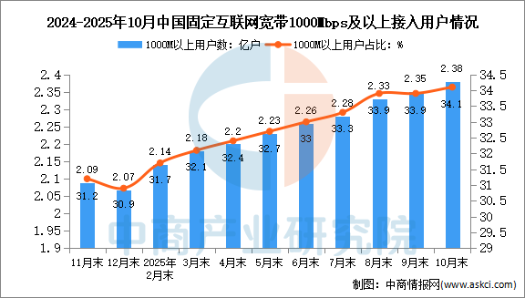 截至10月末,三家基础电信企业的固定互联网宽带接入用户总数达6.97亿户,比上年末净增2701万户。其中,100Mbps及以上接入速率的固定互联网宽带接入用户达6.63亿户,占总用户数的95.1%;1000Mbps及以上接入速率的固定互联网宽带接入用户达2.38亿户,比上年末净增3113万户,占总用户数的34.1%,占比较上年末提升3.3个百分点。