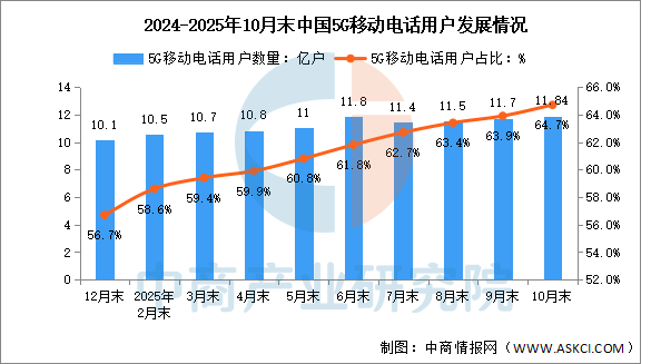 截至10月末,三家基础电信企业及中国广电的移动电话用户总数达18.3亿户,比上年末净增4015万户。其中,5G移动电话用户达11.84亿户,比上年末净增1.7亿户,占移动电话用户的64.7%。