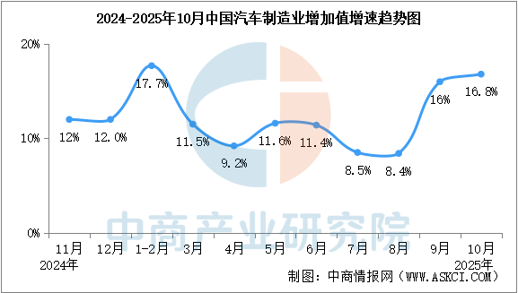 2025年10月,规上汽车制造业增加值同比增长16.8%,环比增长0.8个百分点。2025年1-10月,规上汽车制造业增加值同比增长11.8%。