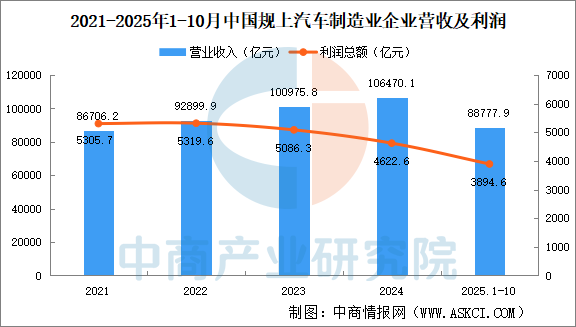 电子游艺官网讯:2025年1-10月,中国规上汽车制造业营业收入88777.9亿元,同比增长7.9%。营业成本78242.9亿元,同比增长8.7%。利润总额3894.6亿元,同比增长4.4%。