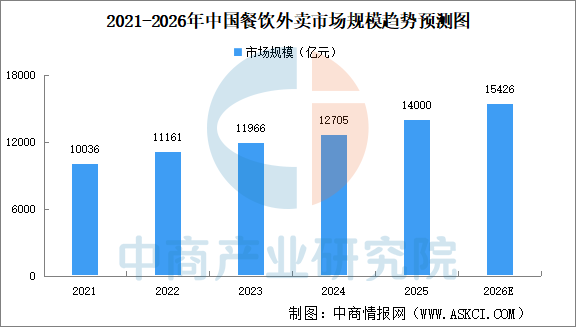 近年来,中国餐饮外卖行业市场规模呈现出显著的增长趋势。中商产业研究院发布的《2026-2031年中国外卖平台服务市场调查与投资机会前景专题研究报告》显示,2024年全国餐饮外卖市场规模超过1.27万亿元,同比增长6.2%,占全国餐饮收入的22.8%,较2023年提升了0.2个百分点。2025年全国餐饮外卖市场规模突破1.4万亿元。中商产业研究院分析师预测,2026年中国餐饮外卖市场规模将超1.5万亿元。