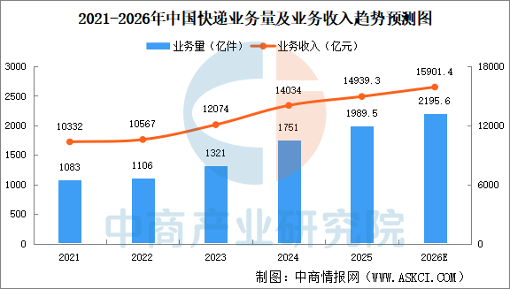 随着电商下沉、直播带货等新业态的普及,以及农村寄递物流体系的持续完善,中国快递业规模保持稳步增长态势。中商产业研究院发布的《2026-2031年中国快递业深度研究及发展前景投资预测分析报告》显示,2025年中国快递业务量完成1989.5亿件,同比增长13.6%。快递业务收入累计完成14939.3亿元,同比增长6.5%。中商产业研究院分析师预测,2026年中国快递业务量完成2195.6亿件,快递业务收入累计完成15901.4亿元。