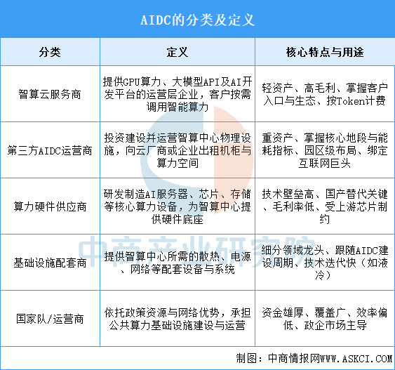 AIDC是Artificial Intelligence Data Center(人工智能数据中心)的缩写,中文常称为人工智能计算中心或智算中心。它是一种专门为支撑人工智能训练与推理任务而设计的高性能算力基础设施。AIDC是专为AI计算任务提供算力、算法与数据服务的新型基础设施,按产业链角色可分为上述五类主体,分别承担智能服务交付、物理空间运营、算力设备制造、基础设施配套与公共基建职能。