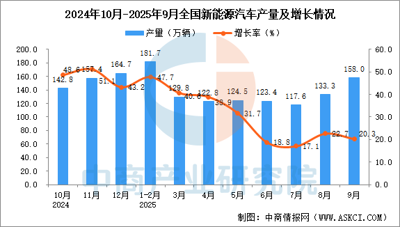 电子游艺官网讯:据中商产业研究院数据库,2025年9月全国新能源汽车产量为158.0万辆,同比增长20.3%。2025年1-9月全国新能源汽车产量为1096.2万辆,同比增长29.7%。