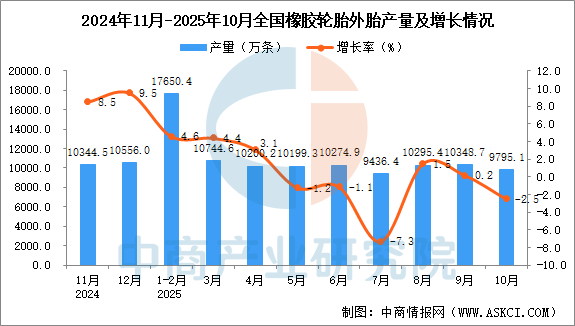2025年10月全国橡胶轮胎外胎产量增长情况
