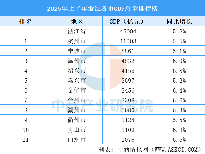 电子游艺官网讯:上半年,浙江经济运行稳中有进、向新向好。全省地区生产总值(GDP总量)45004亿元,按不变价格计算,同比增长5.8%。其中,杭州以11303亿元GDP总量位居榜首,宁波紧随其后,GDP总量8861亿元。温州排名第三,GDP总量4832亿元。绍兴GDP总量超4000亿元。嘉兴、金华、台州、湖州GDP总量位于2000-3000亿元,衢州、舟山GDP总量超1000亿元。