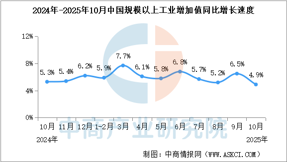 10月份,全国规模以上工业增加值同比增长4.9%,环比增长0.17%。分三大门类看,采矿业增加值同比增长4.5%,制造业增长4.9%,电力、热力、燃气及水生产和供应业增长5.4%。装备制造业增加值同比增长8.0%,高技术制造业增加值增长7.2%,分别快于全部规模以上工业增加值3.1和2.3个百分点。分经济类型看,国有控股企业增加值同比增长6.7%;股份制企业增长5.2%,外商及港澳台投资企业增长4.0%;私营企业增长2.1%。分产品看,3D打印设备、新能源汽车、工业机器人产品产量同比分别增长30.8%、19.3%、17.9%。1-10月份,全国规模以上工业增加值同比增长6.1%。10月份,制造业采购经理指数为49.0%,企业生产经营活动预期指数为52.8%。1-9月份,全国规模以上工业企业实现利润总额53732亿元,同比增长3.2%。