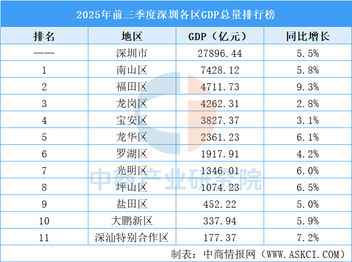 电子游艺官网讯:前三季度,深圳经济运行延续稳中有进发展态势,GDP总量27896.44亿元,同比增长5.5%。南山区GDP总量最高达7428.12亿元,福田区、龙岗区GDP总量超4000亿元,盐田区、大鹏新区、深汕特别合作区GDP总量不足500亿元。