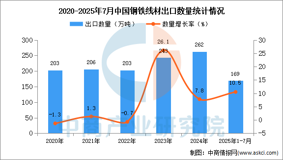 电子游艺官网讯:据中商产业研究院数据库显示,2024年中国钢铁线材出口量262万吨,同比增长7.8%。最新数据显示,2025年1-7月中国钢铁线材出口量169万吨,同比增长10.5%。