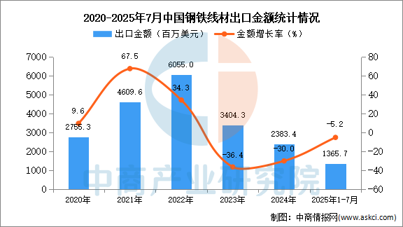 从金额方面来看,数据显示,2025年1-7月中国钢铁线材出口金额1365.7百万美元,同比下降5.2%。