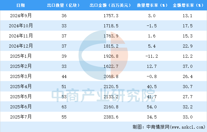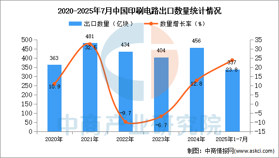 电子游艺官网讯:据中商产业研究院数据库显示,2024年中国印刷电路出口量456亿块,同比增长12.8%。最新数据显示,2025年1-7月中国印刷电路出口量337亿块,同比增长23.8%。