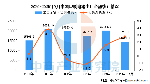 从金额方面来看,数据显示,2025年1-7月中国印刷电路出口金额14413.1百万美元,同比增长28%。