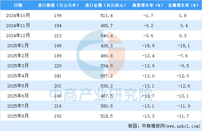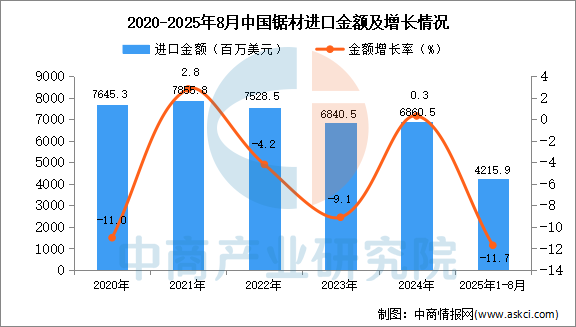 2025年8月中国锯材进口量及金额增长情况