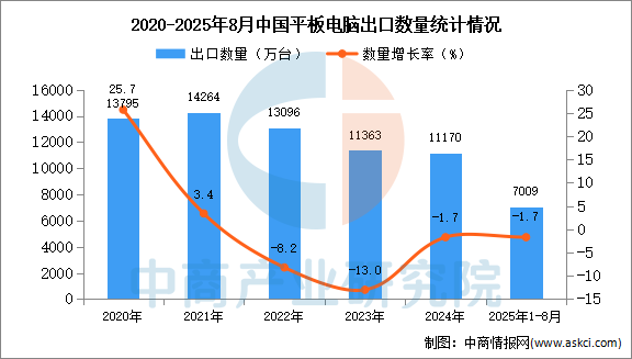 电子游艺官网讯:据中商产业研究院数据库显示,2024年中国平板电脑出口量11170万台,同比下降1.7%。最新数据显示,2025年1-8月中国平板电脑出口量7009万台,同比下降1.7%。