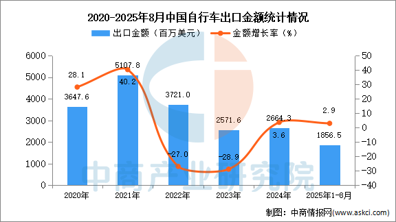 从金额方面来看,数据显示,2025年1-8月中国自行车出口金额1856.5百万美元,同比增长2.9%。
