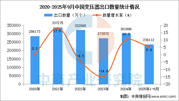 电子游艺官网讯:据中商产业研究院数据库显示,2024年中国变压器出口量301896万个,同比增长10.3%。最新数据显示,2025年1-9月中国变压器出口量236112万个,同比增长5.4%。
