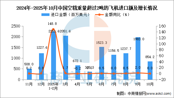 2024年10月中国空载重量超过2吨的飞机进口量及金额增长情况