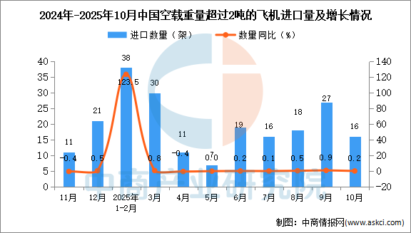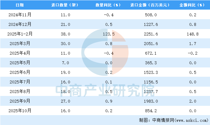 电子游艺官网讯:据中商产业研究院数据库显示,2025年10月中国空载重量超过2吨的飞机进口量16架,同比增长0.2%;1-10月我国空载重量超过2吨的飞机累计进口量181架,同比增长43.7%。