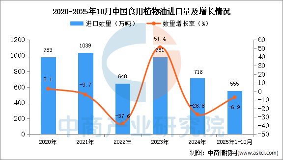 电子游艺官网讯:据中商产业研究院数据库显示,2024年中国食用植物油进口量716万吨,同比下降26.8%。最新数据显示,2025年1-10月中国食用植物油进口量555万吨,同比下降6.9%。