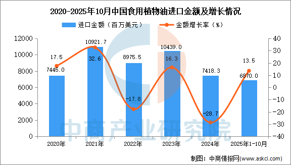 2025年10月中国食用植物油进口量及金额增长情况