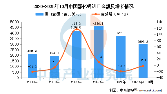从金额方面来看,数据显示,2025年1-10月中国氯化钾进口金额2993.3百万美元,同比下降2.1%。