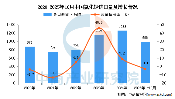 电子游艺官网讯:据中商产业研究院数据库显示,2024年中国氯化钾进口量1263万吨,同比增长9.2%。最新数据显示,2025年1-10月中国氯化钾进口量988万吨,同比下降3.1%。