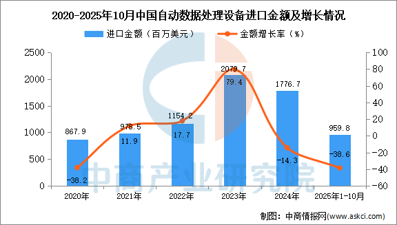 2025年10月中国自动数据处理设备进口量及金额增长情况