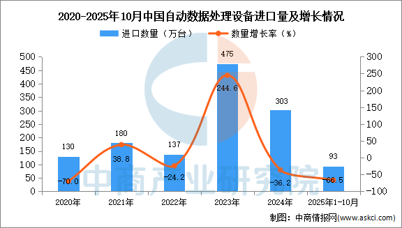 电子游艺官网讯:据中商产业研究院数据库显示,2024年中国自动数据处理设备进口量303万台,同比下降36.2%。最新数据显示,2025年1-10月中国自动数据处理设备进口量93万台,同比下降66.5%。