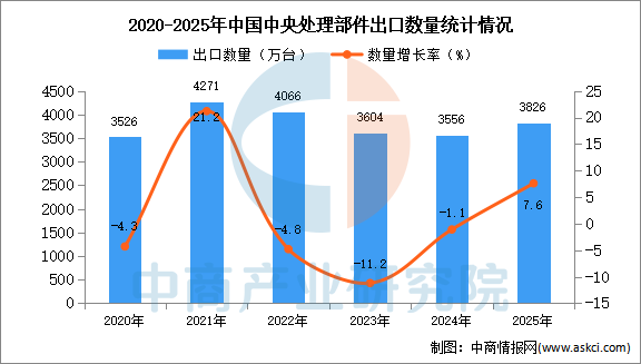 电子游艺官网讯:据中商产业研究院数据库显示,2024年中国中央处理部件出口量3556万台,同比下降1.1%。最新数据显示,2025年1-12月中国中央处理部件出口量3826万台,同比增长7.6%。