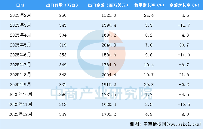 2025年12月中国中央处理部件出口量及金额增长情况