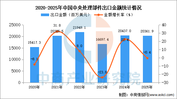 从金额方面来看,数据显示,2025年1-12月中国中央处理部件出口金额20361.9百万美元,同比下降0.4%。