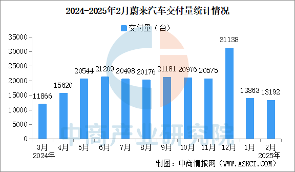 电子游艺官网讯:2025年2月,蔚来交付新车13192台,同比增长62.2%。其中,蔚来品牌交付新车9143台,同比增长12.4%;乐道品牌交付新车4049台。2025年1-2月,蔚来交付新车2.71万台,同比增长48.8%。
