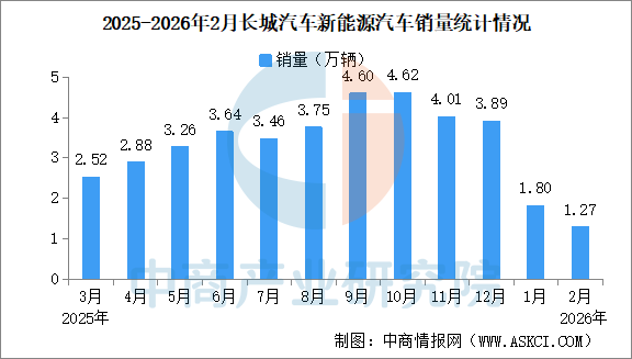 2026年2月,长城汽车新能源车销售1.27万辆,同比减少15.7%。2026年1-2月,长城汽车新能源汽车累计销售3.08万辆,同比减少17.7%。
