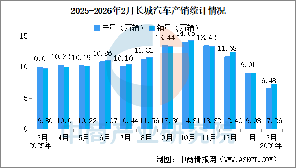 电子游艺官网讯:2026年2月,长城汽车产量6.48万辆,同比减少13.42%。销量7.26万辆,同比减少6.79。2026年1-2月,长城汽车累计产量15.49万辆,同比减少1.58%。累计销量16.29万辆,同比增长2.58%。