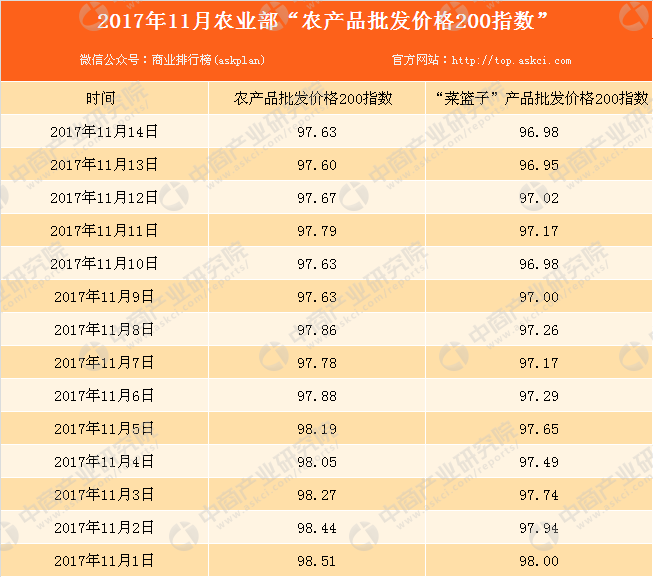电子游艺官网讯:据农业部监测,11月14日“农产品批发价格200指数”为97.63,比昨天上升0.03个点,“菜篮子”产品批发价格200指数为96.98,比昨天上升0.03个点。