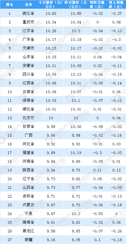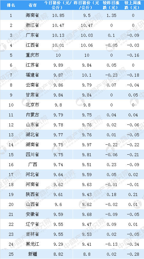 从内三元生猪价格来看,5月8日全国内三元生猪价格最高的是海南省,达10.85元/公斤。浙江省和广东省则分别位列第二、第三。