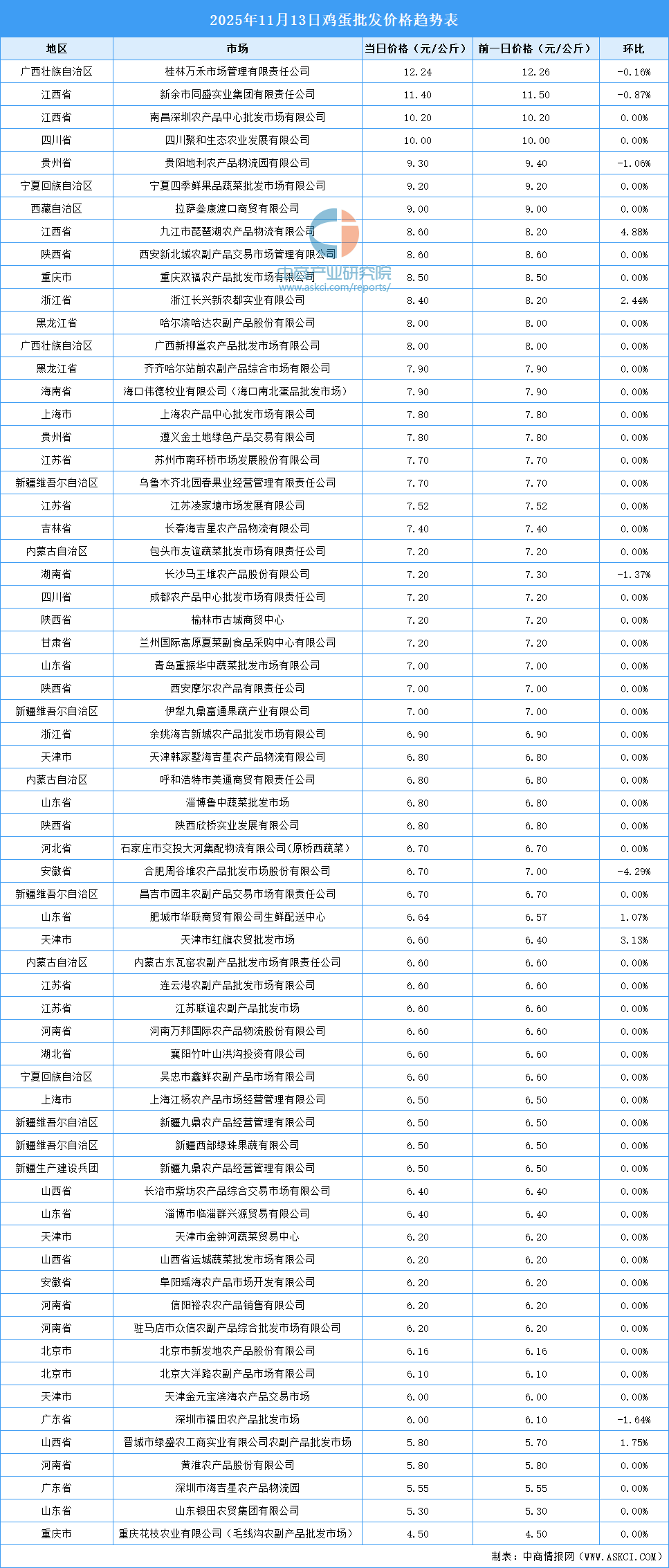 电子游艺官网讯:最新数据显示:11月13日全国鸡蛋平均价格为7.20元/公斤。其中,鸡蛋价格最高的市场是桂林万禾市场管理有限责任公司,当日价格为12.24元/公斤,环比下跌0.16%。鸡蛋价格最低的市场是重庆花枝农业有限公司(毛线沟农副产品批发市场),当日价格为4.50元/公斤,环比持平。